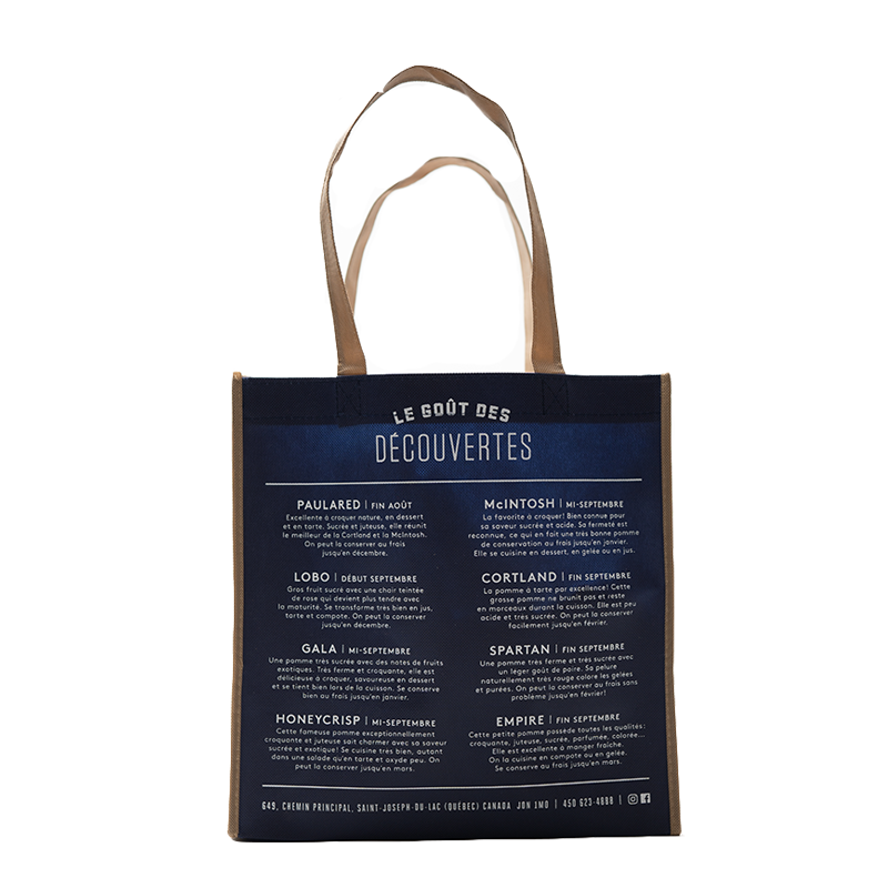 Sac réutilisable Lacroix, présentant les différentes variétés de pommes offertes au verger.